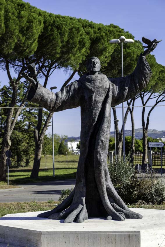 La statua di San Francesco all’aeroporto, è collocata sulla rotatoria di Sant’Egidio sul territorio di Perugia, su basamento di cemento, in bronzo fuso a “cera persa”, per un diametro di 2,5 metri e per un’altezza di 3,2, del peso di 15 quintali.
