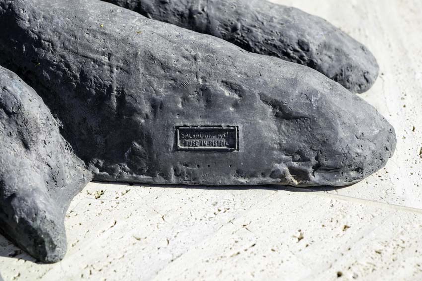 Il santo è tratteggiato nel volto secondo un’iconografia depositata, che si rifà alla pittura senese e umbra del medioevo, altrettanto classiche sono le metafore che suggerisce: tiene in mano due tortore dalle ali aperte; il corpo è ricoperto da un saio che imita un albero, con tanto di fenditura centrale, come si presentano certe antiche piante di ulivo e termina con forme che paiono radici che si spalmano sulla piattaforma: natura, amore, pace.
